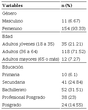 Se evaluaron 165 participantes, divididos en 11 hombres (6.67 %) y 154 mujeres (93.33 %), los cuales se agruparon en cuatro grupos: el primero se formó con 32 mujeres con diagnóstico de fibromialgia indicado por médicos especialistas; el segundo por 61 personas con dolor crónico no explicado por la fibromialgia (neuralgia post herpes zóster, neuropatía diabética y osteoporosis); el tercero por 19 mujeres con cáncer de mama; y el cuarto grupo por 53 participantes libres de dolor crónico. Los primeros tres grupos se conformaron con pacientes atendidos por primera vez o en seguimiento en el Hospital General Dr. Manuel Gea González de la Ciudad de México, mientras que las participantes libres de dolor crónico, fibromialgia o cáncer de mamá fueron invitadas a participar de manera voluntaria mediante un muestreo bola de nieve, y se aplicó la escala de manera presencial en la Facultad de Psicología de la UNAM y vía electrónica con Google Forms.