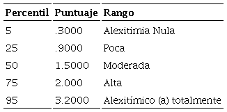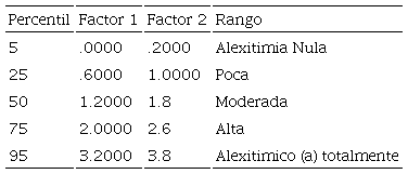 Escala de Alexitimia de Toronto (TAS-10). Se utilizó la Escala de Toronto de Alexitimia (TAS-10, por sus siglas en inglés) fue creada por (Taylor et al.,1985, como se citó en Sáez & Tizando, 2012), un instrumento de autorreporte con 20 reactivos distribuidos en 3 factores. En México, se ha validado en más de una ocasión; sin embargo, se eligió la versión de Weisel (2007), por tres razones: la primera, alude a los dos factores significativos de esta escala que diferencian a la población con dolor crónico de aquella libre de dolor, que reportaron Shibata, et al. (2014) y, en México, Fresán et al. (2020): Factor 1 (F1), Dificultad para identificar Sentimientos y Factor 2 (F2), Dificultad para Describir los Sentimientos y Emociones. Segundo, la confiabilidad del tercer factor (F3) Pensamiento Externamente Orientado, reportada por Moral (2008) en población mexicana era baja (α < .60), por lo que en esta investigación se consideró utilizar la versión con consistencia interna aceptable reportada con dos factores de Weisel (2007), con un α = 0.778 y un 42.51% de varianza explicada. Tercero, es la versión más corta de aplicar en el contexto del sistema público de salud en México, donde se hace necesario el uso de instrumentos cortos, válidos y confiables. La tabla 2 y 3 presentan los baremos de los puntajes de alexitimia.