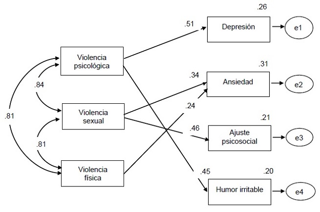 En la Figura 1 se muestra la representación gráfica del modelo estimado y los coeficientes estandarizados. El coeficiente de predicción para el factor de depresión fue de R²= .26, siendo el principal predictor el factor de violencia psicológica (β= .510, p<.05). La dimensión de ansiedad tuvo un coeficiente de predicción de R²= .31, predicha por los factores de violencia sexual (β= .340, p<.05) y violencia física (β= .240, p<.05). En cuanto al ajuste psicosocial, se obtuvo un coeficiente de predicción de R²= .21, predicho por la dimensión de violencia sexual (β= .455, p<.05), mientras que en la dimensión de humor irritable se adquirió un coeficiente de predicción de R²= .20, predicho por la dimensión de violencia psicológica (β= .446, p<.05).
