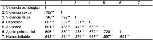 En el análisis paramétrico de correlación r de Pearson, se obtuvieron coeficientes significativos débiles a moderados. En ellos se encontró que la presencia de violencia psicológica y sexual se asocia con síntomas emocionales de depresión, ansiedad, ajuste psicosocial y humor irritable. En cuanto a la violencia física, se vincula con depresión, ansiedad, humor irritable y ajuste psicosocial (Tabla 1).