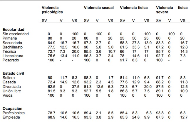 Además, las mujeres que más perciben violencia fueron las divorciadas, las casadas, las que viven en unión libre y finalmente las solteras. En relación con la ocupación de las mujeres, las que sufren más violencia psicológica son aquellas que se dedican al hogar o son empleadas, las que experimentan más violencia sexual son amas de casa, profesionistas y empleadas; mientras que las mujeres que más padecen violencia física y física severa son las comerciantes, estudiantes, seguidas de las amas de casa, empleadas y disminuye en las profesionistas.