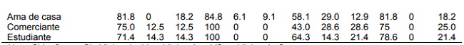 Las participantes indicaron su ocupación, informando que el 50.5 % son empleadas, 22.9 % profesionistas (médico, enfermera, psicóloga, docente, investigadora), 16.2 % amas de casa, 6.7 % estudiantes y 3.8 % comerciantes. En la escolaridad se obtuvo que 35.2 % tiene licenciatura, 24.2 % cursaron una carrera técnica, 16.9 % bachillerato, 15.7 % secundaria, 5.1 % posgrado, 2.5 % primaria y .4 % sin escolaridad.