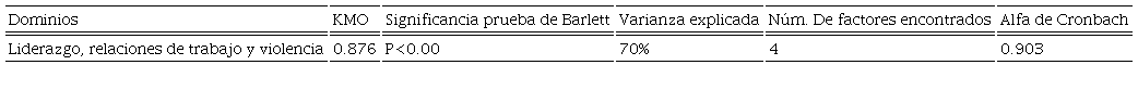 Liderazgo y relaciones en el trabajo. Este factor de acuerdo con la norma incluye tres dominios: liderazgo, relaciones en el trabajo y violencia. Los ítems evaluados son 31-34, 37-39, 40-46, 69-72 y 57-64. Los resultados del AFE y AFC son los siguientes (Tablas 11 y 12):