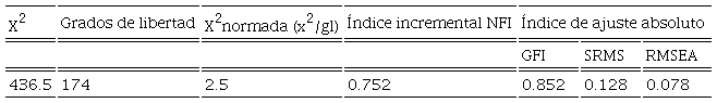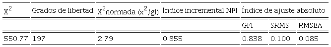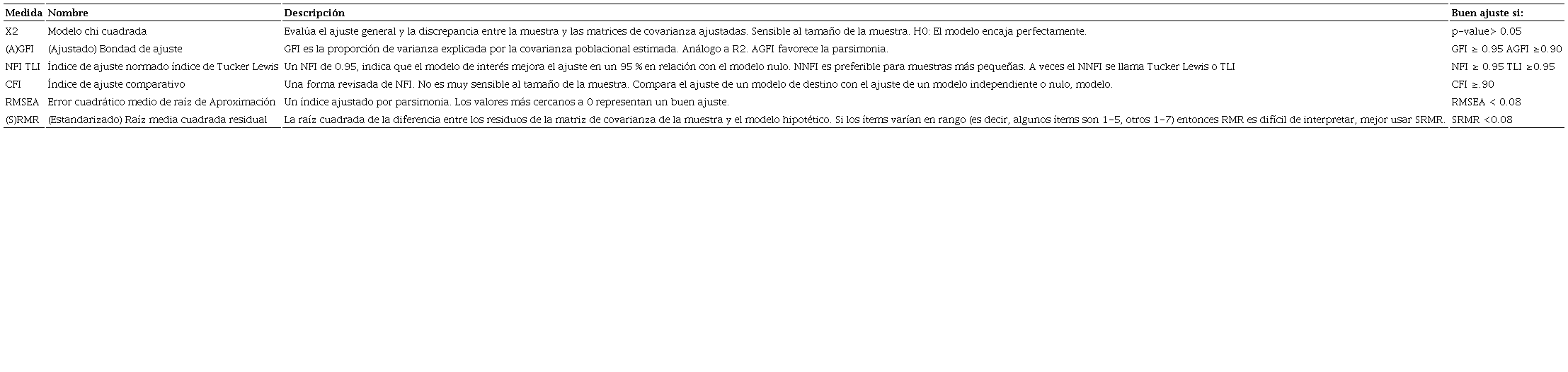 De acuerdo con la normatividad propuesta en el Diario Oficial de la Federación (DOF, 2018), se deben de cumplir con los requisitos estadísticos adecuados: 1) de confiabilidad (alfa de Cronbach) superiores a 0.7, 2) de correlación (Pearson o Spearman), con r mayor a 0.5, y significancia menor o igual a 0.05; 3) tener validez de constructo mediante análisis factorial confirmatorio cumpliendo con medidas e índices de ajuste siguientes: a) de ajuste absoluto con los índices, b) índice de bondad de ajuste, GFI (Goodness of Fit Index) mayor a 0.90, c) residuo cuadrático medio, RMSR (Root Mean Square Residual), cercano a 0 y máximo 0.08, d) error de aproximación cuadrático medio, RMSEA (Root Mean Square Error of Approximation) menor a 0.08; e) de ajuste incremental o relativo con el índice de ajuste normado, NFI (Normed Fit Index), mayor a 0.90, y f) de parsimonia con el índice ji cuadrada normada: X2/gl menor o igual a 5, y que se aplique a una población trabajadora semejante. Los parámetros anteriormente mencionados son los que generalmente se utilizan para validar un modelo (Vargas-Chanes, 2019).