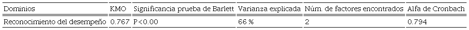 Entorno organizacional. Para la variable de entorno organizacional solamente se probó el dominio de reconocimiento del desempeño, que comprende los ítems 47-52. El domino de insuficiente sentido de pertinencia e inestabilidad no fue significativo estadísticamente en el AFE, y comprendía los ítems 53-56. Los resultados se muestran en las Tablas 13 y 14.