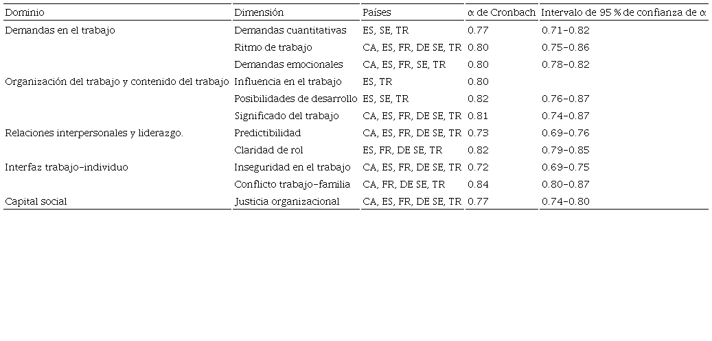 En 2019, Burr et al. (2019) presentaron un estudio con la versión “COPSOQ III”, cuyos resultados se pueden consultar en la página https://www.copsoq-network.org. Actualmente, se dispone de un instrumento validado e implementado en Canadá, Francia, España, Alemania, Suecia y Turquía. La norma presenta cinco factores a evaluar: 1) demandas en el trabajo, 2) trabajo-organización y contenidos del trabajo, 3) relaciones interpersonales y liderazgo, 4) interfase trabajo-individuo y 5) capital social. En la Tabla 1 se muestran algunos ejemplos del dominio y dimensiones validadas; los datos presentados corresponden a 23 361 trabajadores y fueron recabados entre 2016 y 2017 n los países antes mencionados. El porcentaje de mujeres fue de 52 %, el 9 % menores de 25 años; de 25 a 34 años, el 24 %; de 40 a 49 años, el 27 %; y mayores de 55 años, el 14 %. Debido a que la norma se puede distribuir gratuitamente, actualmente 18 países participan activamente en el desarrollo del instrumento; México no forma parte de la lista. La única restricción para adherirse a estos estudios es que no se deben de alterar los ítems y se debe dar aviso al comité que la administra.