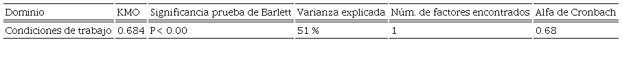 Ambiente de trabajo. Para la variable ambiente de trabajo que únicamente contiene al dominio condiciones del ambiente de trabajo se tomaron en cuenta los ítems 1, 2, 3 y 5. El ítem 4 se descartó por no presentar la carga necesaria en el análisis factorial exploratorio (menor de 0.40). La Tabla 5 muestra los resultados del análisis y adicionalmente se presenta el alfa de Cronbach. La Tabla 6 muestra el AFC con los resultados del AFE. Este procedimiento se realizó de manera semejante para todas las categorías.