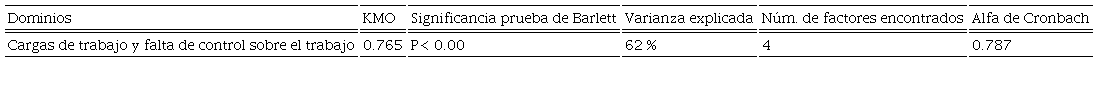 Factores propios de la actividad. Esta variable, de acuerdo con la norma, contiene dos dominios: cargas de trabajo y falta de control sobre el trabajo. Los ítems evaluados fueron 6,12, 7, 8, 9, 10, 11, 65, 66, 67, 68, 13, 14, 15, 16, 25, 26, 27, 28, 23, 24, 29, 30, 35 y 36. En la Tabla 7 se muestran los resultados del AFE y en la Tabla 8 el AFC.