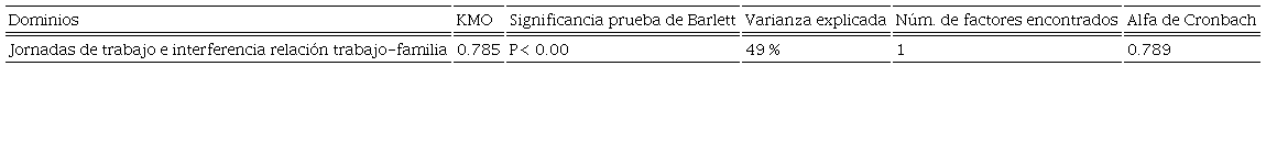 Organización del tiempo del trabajo. De acuerdo con la norma esta variable incluye dos dominios: jornada de trabajo e interferencia en la relación trabajo-familia. Los ítems evaluados son del 17 al 22. Los resultados del análisis factorial exploratorio y confirmatorio se muestran en las Tablas 9 y 10: