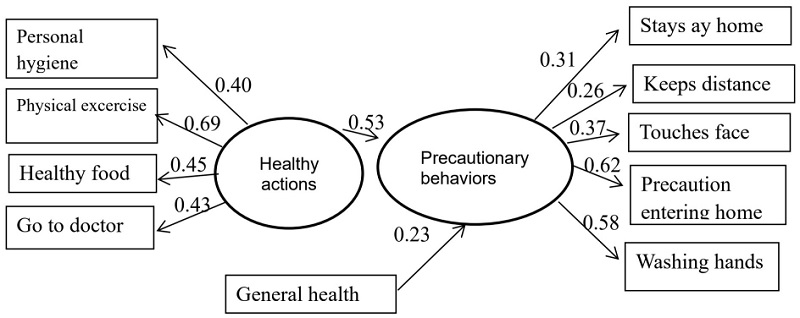 The results of the tested models are shown in Figures 1 through 3. In model 1 (health sciences), both predictors-the factor healthy actions (β = 0.53), and the manifest variable general health conditions (β = 0.23)-positively and significantly (p < 0.05) influenced engagement in precautionary behaviors. The R2 for this model was 0.23, meaning that these two predictors explain twenty-three percent of the variance in the dependent variable.