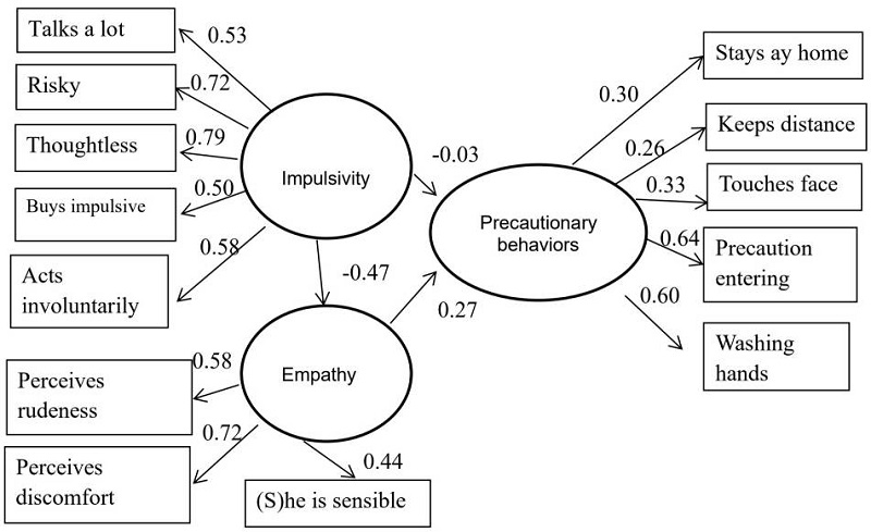 In model 2, only empathy (β = 0.53) produced a significant (p < 0.05) impact on precautionary behaviors; yet the influence of impulsivity was indirect, negatively affecting these precautionary activities through empathy (β = -0.47). This model performed poorly since it only explained eight percent of the dependent variable variance.