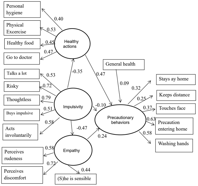 Finally, results from model 3 showed that healthy actions (β = 0.47) and empathy (β = 0.24), but not general health condition (β = 0.09) and impulsivity (β = 0.10), positively and significantly (p < 0.05) influenced precautionary behaviors against COVID-19. Impulsivity played the role of connection between the two disciplinary models, significantly (p < 0.05) and negatively affecting both healthy actions (β = -35) and empathy (β = -0.47). The R2 for this model was 0.29.