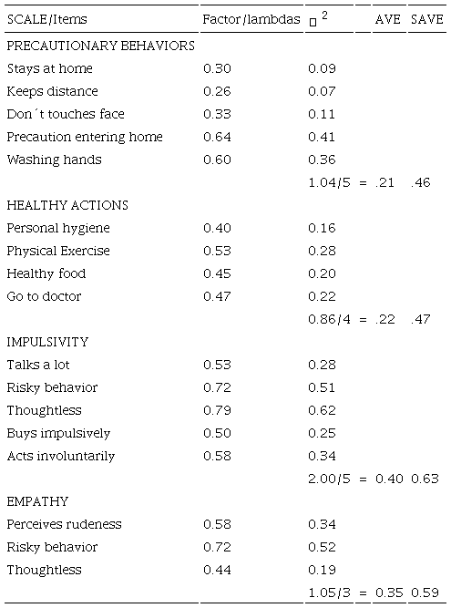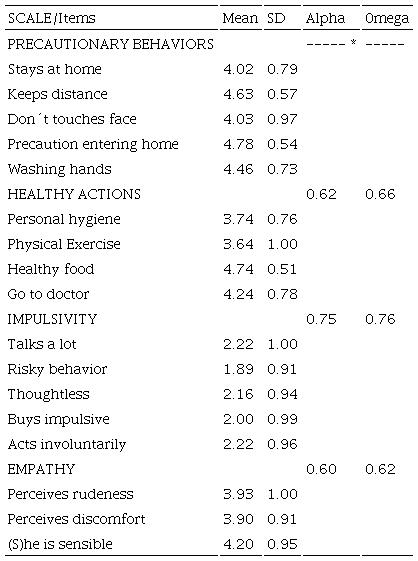The instruments assessed psychological factors such as empathy and impulsivity. Variables related to general health practices (such as diet and exercise) and pandemic-specific precautionary behaviors (handwashing, social distancing, etc.) were assessed as well as self-report of general health condition. Empathy was assessed using four Likert-type (0-4) items from the Loewen et al. (2009) Empathy Quotient, which, in turn, is a short form of the one from Wakabayashi et al. (2006). Examples of these items include, “I find it hard to know what to do in a social situation” and “I often find it hard to judge if something is rude or polite.” The internal consistency of this scale was α = 0.64. Impulsivity was assessed through eight items from the Corr and Cooper (2016) Reinforcement Sensitivity Theory Personality questionnaire. This instrument uses a response scale ranging from 1 (“it does not apply to me”) to 5 (“it absolutely applies to me”); with “I always buy things impulsively” and “I recognize that I do thing without thinking” as examples of this scale, which was translated to Spanish and validated by Espinoza-Romero et al. (2019) in Mexico. Its internal consistency was α = 0.74.