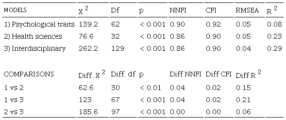 The three models exhibited similar goodness of fit: the health sciences model resulted in χ2=76.6 (32 df, p < 0.001); BBNNFI = 0.86, CFI = 0.90, RMSEA = 0.05. The psychological model produced a χ2= 139.2 (62 df, p < 0.001); BBNNFI = 0.90, CFI = 0.92, RMSEA = 0.05. The goodness of fit indicators for the interdisciplinary model were: χ2 = 262.2 (129 df, p < 0.001); BBNNFI = 0.86, CFI = 0.90, RMSEA = 0.04.