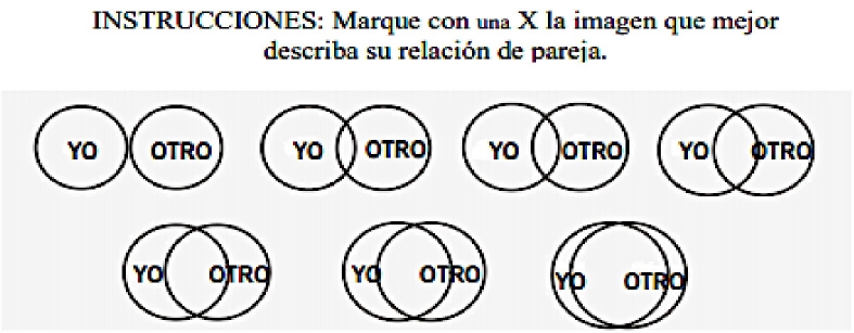 Escala de inclusión del otro en el yo (Aron et al., 1992; Sánchez Aragón, 1995): dirigido a evaluar la cercanía que el individuo percibe con su pareja. Consta de un único reactivo pictórico con formato de respuesta Likert de 7 opciones que reflejan diferentes grados de traslape entre dos círculos, como un diagrama de Venn (ver Figura 1).