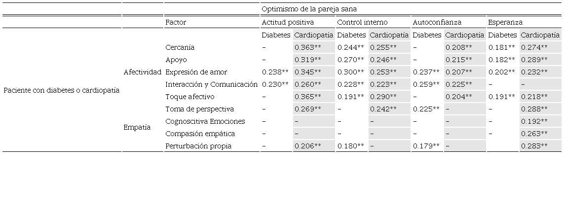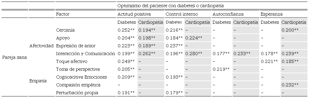 Los análisis de correlación de Spearman mostraron que, cuando el miembro sano de la relación interactuó y se comunicó positivamente con el paciente diabético, además de crear una actitud positiva y control interno en el enfermo, este tuvo más autoconfianza y esperanza. Aunado a ello, en la medida en que la pareja sana se sintió más cercana al paciente diabético, dio apoyo y expresó su amor, el paciente desarrolló una mayor actitud positiva y mayor control interno.