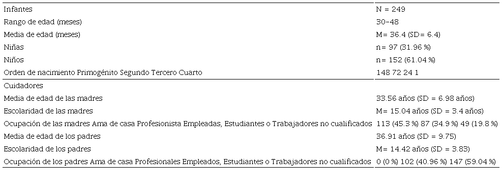 La presente investigación, al buscar estudiar la relación entre la producción verbal de cuidadores e infantes, utiliza un diseño no-experimental correlacional de alcance transversal. Participaron 249 díadas (un cuidador adulto y un infante). En relación a los cuidadores, el promedio de edad fue de 36.91 años (SD = 9.75), con un nivel socioeconómico medio hasta alto, con escolaridad mínima de bachillerato y que el español fuera su primera lengua. Los criterios de inclusión para los infantes fueron tener como primera lengua el español, nacidos a término, sin problemas de alto riesgo de tipo prenatal, al nacimiento o post-parto, sin problemas de audición o visión ni antecedentes de enfermedades graves. el rango de edad de los infantes fue de 30 a 48 meses de edad.