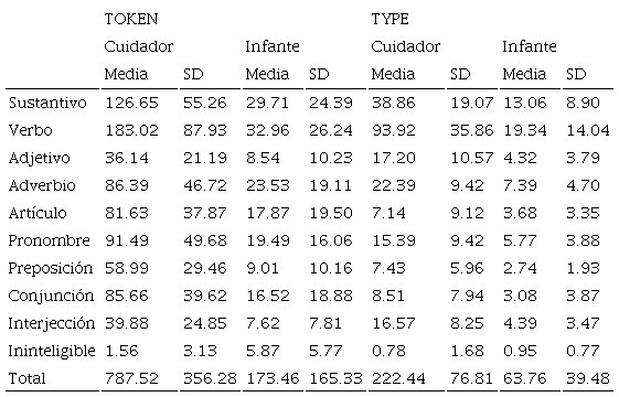 Como se expuso anteriormente, el objetivo principal del presente estudio fue determinar si la producción verbal de los cuidadores es un predictor de la producción verbal de los infantes en las edades estudiadas durante las interacciones en la tarea de lectura conjunta. A continuación, se muestran los resultados de la producción verbal diádica durante la tarea de lectura conjunta. Primero, se presentan las medias de producción en términos de las medidas type, token y por categoría gramatical. Después, se presentan los resultados de las correlaciones obtenidas también en términos de type, token y categoría gramatical. Por último, se muestran los resultados de los análisis de regresión lineal con el fin de determinar si la producción verbal de los infantes es predicha por el lenguaje productivo de los cuidadores durante la tarea de lectura conjunta.