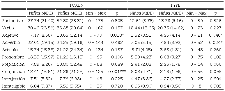 Por otra parte, al comparar la producción verbal de los infantes según el sexo, contrario a la literatura previa (Højen et al. 2022), los análisis de comparación de medias mostraron que no existen diferencias significativas entre la producción verbal de niñas y niños, a excepción de la producción de adjetivos y conjunciones en términos de tokens y de las categorías adjetivos y adverbios en la medida type. Esto puede ser explicado por la influencia del contexto de interacción en el que este estudio fue realizado, por lo que es posible que la tarea de lectura conjunta sea un contexto estimulante que promueve la producción verbal de los infantes, facilitando la producción verbal en ambos sexos.