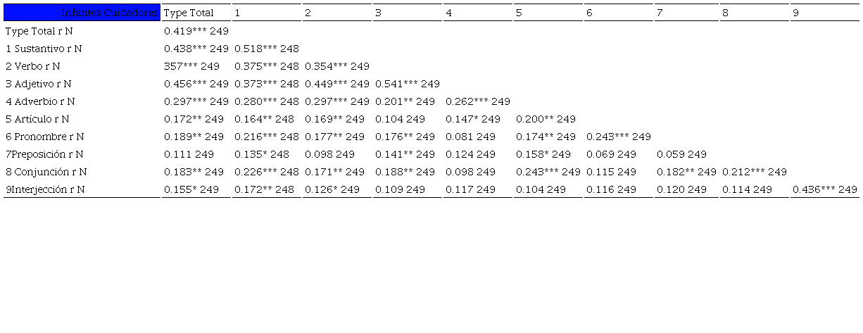 Para evaluar la relación entre la producción verbal de cuidadores e infantes, se realizaron correlaciones de Spearman entre las medidas token (ver Tabla 4) y type (ver Tabla 5) emitidos por las díadas, encontrándose correlaciones estadísticamente significativas en todas las categorías gramaticales a excepción de las preposiciones en la medida type.