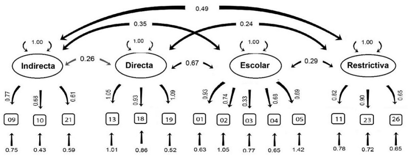 En la Figura 1 se presenta el AFC de los adolescentes que mostró, en general, índices adecuados de bondad de ajuste (CFI = .97, RMSEA =.03, IC 90% [.00, .05], GFI= .96, SRMR= .06, Chi2= 94.940, gl= 73, p = .04). Todos los reactivos presentaron cargas estadísticamente significativas sobre sus factores con valores de 0.32 - 1.048, valores de Z entre 7.9 - 15.2 y niveles de p = 0.001. La consistencia interna de la escala fue de ω= .80.