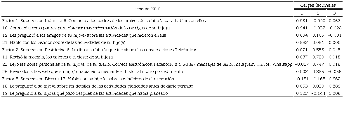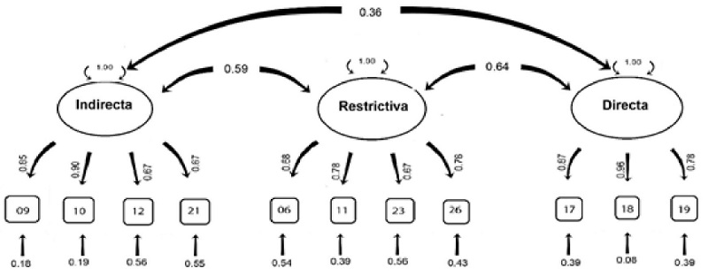 El AFE en padres mostró un índice KMO= .81 y los valores en la prueba de Bartlett fueron estadísticamente significativos (Chi2 = 1005.807, gl = 55, p = 0.01), lo que indicó que teóricamente era posible extraer factores. En el análisis paralelo se sugirió la extracción de tres factores que superaron el promedio de varianza aleatoria. Esta resolución excluyó cuatro factores de la escala original. En Tabla 2 se presenta la solución de tres factores que incluyó reactivos conceptualmente congruentes; la SI en el primer factor (promedio 3.73, DE= 3.68, varianza común explicada 40.1% y ω= .74); SR en el segundo factor (promedio 6.84, DE= 6.6, varianza común explicada 6.6% y ω= .85) y SD en el tercer factor (promedio 6.84, DE= 2.88, varianza común explicada 16.6% y ω= .75). Los índices de bondad de ajuste fueron adecuados (RMSEA =.04, IC 90% [.01, .08], TLI =.97, BIC= -91.629) (Coke et al., 1978) y una varianza total explicada del 65%.
