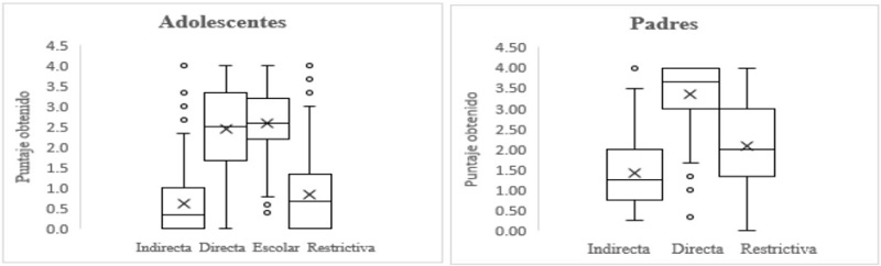 En la Figura 3 se muestra la distribución de las respuestas y los promedios obtenidos para los adolescentes y los padres por cada estrategia de SP con diagramas de caja y bigotes. Como se observa, la mayoría de los adolescentes reportó que sus padres usaron SD y SE. El 35% reportó que sus padres usaron dos estrategias SE y SD, el 28% reportó tres estrategias SE, SD y SI y el 35.3% cuatro estrategias. Los padres reportaron SD, seguida de SR. El 90% de los padres utilizó dos estrategias de SP y el 10% reportó no incluir SR.