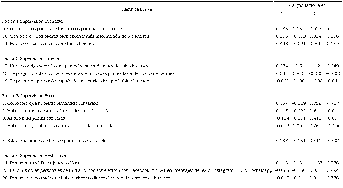 Resumen: La escala de supervisión parental ha demostrado niveles adecuados de validez y factibilidad en EEUU y ante la falta de instrumentos que evalúen este constructo en México, el objetivo de este estudio fue adaptar y validar al español la escala Parental Monitoring Instrument en adolescentes mexicanos y sus padres, así como evaluar su validación mediante criterios externos. Se incluyeron 448 adolescentes de escuelas públicas de Guadalajara y 215 padres de adolescentes. La escala no fue equivalente para adolescentes y padres. La versión de adolescentes tuvo una estructura de cuatro dimensiones, mientras que la de padres fue de tres. La confiabilidad de la escala fue de ω =80 y ω = 83 respectivamente. En la validación mediante criterios se identificó asociación entre la supervisión parental y el consumo de sustancias. En conclusión, la escala de supervisión parental se puede utilizar con adolescentes mexicanos y sus padres. Se alienta a evaluar su estructura psicométrica en otros contextos.