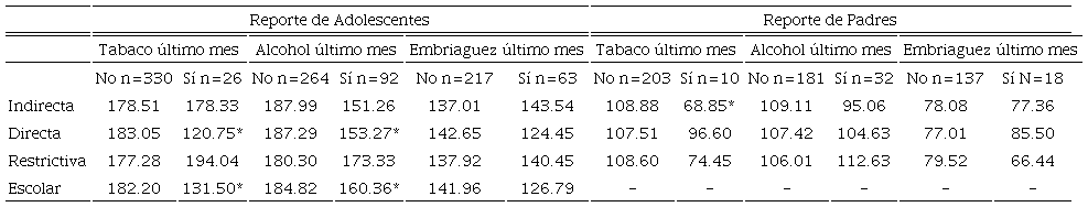 En la Tabla 3 se presenta la comparación de promedios de la SP con el CS en adolescentes y padres. Los adolescentes reportaron menores puntajes de SD para quienes consumían tabaco (Z= 2.986, g.l.= 1, p= 0.003) y alcohol (Z= 2.743 g.l.= 1, p= 0.006). De igual forma, la SE mostró menores puntajes para el grupo con consumo de tabaco (Z= 2.427, g.l.= 1, p= 0.015) y alcohol (Z= 1.970, g.l.= 1, p= 0.049). El reporte de los padres mostró diferencias únicamente en la SI con menores puntajes para quienes reportaron que sus hijos consumían tabaco (Z= 2.017, g.l.= 1, p= 0.044). Por último, la prevalencia del CS entre padres e hijos mostró diferencias, por ejemplo, el 7.8% de los adolescentes reportaron haber fumado en el último mes (UM), mientras que los padres reportaron el 4.9%, y el 7% reportó que no sabía si sus hijos fumaban tabaco. La prevalencia de consumo de alcohol UM en los adolescentes fue de 34.8% y en los padres de 17.7%, y el 7% reportó no saber. Por último, la prevalencia de episodios de embriaguez UM en adolescentes fue del 18.6% y de los padres el 13%, y el 3.5% reportó no saber.