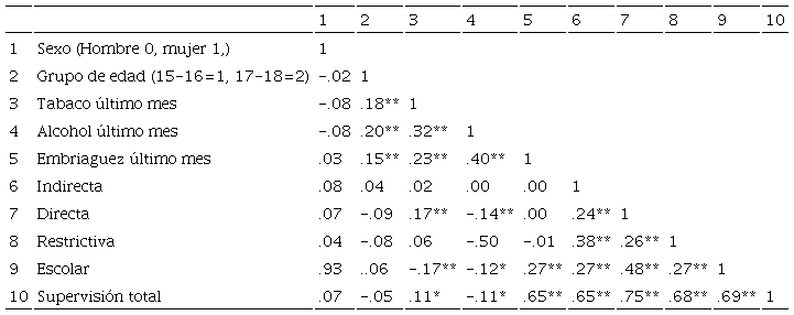 La Tabla 4 muestra los resultados del análisis de correlaciones bivariadas entre los factores de la escala en adolescentes y las variables incluidas. Se encontraron correlaciones positivas entre el CS y embriaguez con grupo de edad y SD, una correlación negativa del consumo de tabaco y alcohol con SE y una correlación positiva entre embriaguez con SE y con el puntaje global de SP. Por último, no se presenta la tabla de las correlaciones de los padres debido a que no fueron significativas la SP con el CS, ni con las variables incluidas, pero sí se encontraron inter-correlaciones significativas entre los factores entre .19 - .39.