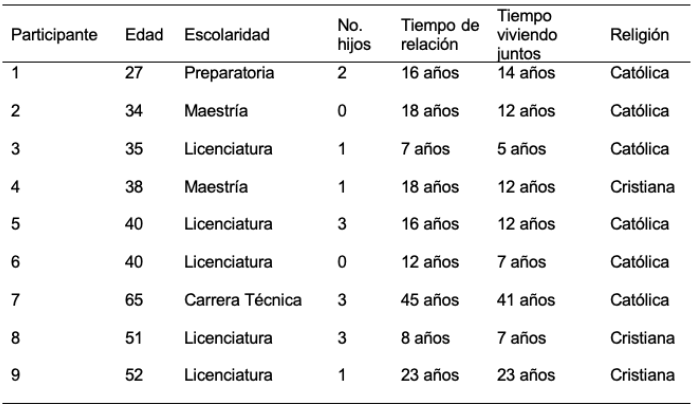Participaron nueve mujeres entre 21 y 65 años residentes del Valle de Toluca que, al momento del estudio, cohabitaban en una relación de pareja con al menos cinco años de duración. La selección se realizó de manera intencional; esta técnica permite seleccionar casos característicos de una población y se utiliza en escenarios en las que la población es muy variable y la muestra es muy pequeña (Otzen y Manterola, 2017). Referente al rango de edad, se consideró incluir mujeres que se encontraban en distintas etapas de la vida: tres adultas jóvenes (21-35 años), tres mujeres adultas de 36 a 50 años y tres adultas mayores (51-65 años) con la finalidad de tener un panorama más amplio sobre las experiencias de las mujeres de distintas edades. Se utilizó el criterio de saturación teórica a partir del muestreo intencional y la experticia del investigador en estudios cualitativos (Ventura y Barboza, 2017). Todas las participantes eran casadas, con estudios superiores, el promedio de hijos fue de 1.5, el tiempo promedio de relación fue 18.1 años y la religión que predominaba era la católica (ver Tabla 1).