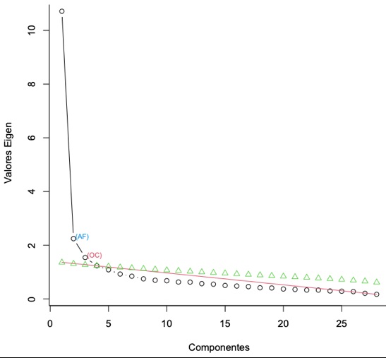 Con base en los resultados reportados en la Tabla 2 se procedió a realizar el AFE. Previamente se aplicó la prueba KMO (0.891) y de esfericidad de Bartlett (3876.89), resultando significativo al 0.001, lo que significa que es pertinente el tamaño de la muestra y el AFE. Para la extracción del número de factores, de acuerdo con Lloret-Segura et al. (2014), existen dos formas de hacerlo, la más usual es someter todos los reactivos al análisis sin establecer criterios para identificar el número de factores; aunque se recomienda el AP como un método más robusto que coadyuva en una mejor toma de decisiones sobre la dimensionalidad del constructo.