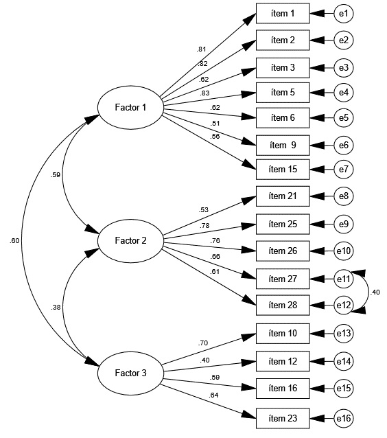 Con base en los resultados obtenidos, se realizó el AFC. En la Tabla 4 se muestran los resultados obtenidos en cuatro modelos, siendo el último el que tuvo un mejor ajuste. De tal manera que la escala quedó conformada por 16 reactivos distribuidos en tres factores (ver Figura 2).