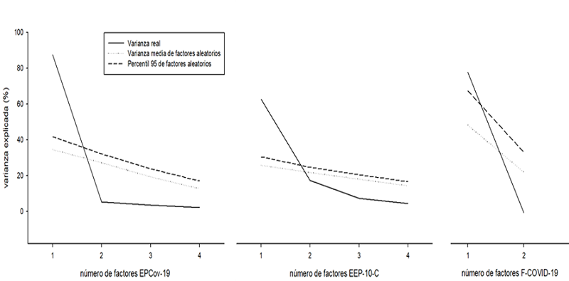 En la validación de las escalas EPCov-19, EEP-10-C y F-COVID-19 en docentes mexicanos de nivel medio superior a posgrado se detectó que cada una posee una estructura unifactorial, equivalente entre sexos, que explican entre el 53 % y 78 % de la varianza y poseen una consistencia interna de elevada a muy elevada. El número de factores a retener, para cada escala, fue identificado mediante la estimación de un análisis paralelo. Consistente con la validación original de la EPCov-19 (Esteban-Carranza et al. 2021), en este estudio se detectó un factor único, al igual que para la escala EEP-10-C (Campo-Arias et al. 2020). Para esta última escala, lo anterior corrobora la estructura originalmente supuesta mediante regla de Kaiser-Guttman. También se detectó un factor único para la escala F-COVID-19, cuando en su validación original, este mismo análisis detectó la presencia de dos (Mejia et al. 2020).