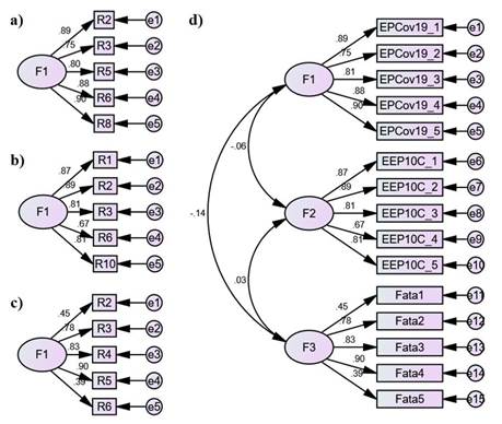 Las pruebas de adecuación muestral de las submuestras empleadas para conducir el análisis factorial confirmatorio indicaron datos aceptables para las tres escalas, EPCov-19, KMO = 0.91 (IC = 0.89 a 0.94), prueba de Bartlett = 1102 p < 0.001, determinante = 0.0007; EEP-10-C, KMO = 0.89 (IC = 0.87 a 0.91), prueba de Bartlett = 696.1 p < 0.001, determinante = 0.01; F-COVID-19, KMO = 0.80 (IC = 0.77 a 0.83), prueba de Bartlett = 400.5 p < 0.001, determinante = .13. El rango de las cargas factoriales y su media para cada modelo fueron, EPCov-19, rango = 0.75 a 0.90, M = 0.84; EEP-10-C, rango = 0.67 a 0.89, M = 0.81; F-COVID-19, rango = 0.39 a 0.90, M = 0.67. La Tabla 2 indica el ajuste inicial y las respectivas re-especificaciones elaboradas, cuando fue pertinente, a fin de alcanzar índices aceptables para los modelos de las escalas EPCov-19, EEP-10-C y F-COVID-19. Durante la re-especificación de los modelos, la escala EPCov-19 perdió los reactivos 1, 4 y 7; mientras que la escala EEP-10-C perdió el reactivo 9; para la escala F-COVID-19, se confirmó la estructura exploratoria (ver Figura 2, incisos a, b y c). La varianza media extraída para cada escala fue: EPCov-19, AVE = 0.71; EEP-10-C, AVE = 0.66; F-COVID-19, AVE = 0.49. La consistencia interna fue, EPCov-19, alfa de Cronbach = 0.92, ω de McDonald = 0.92; EEP-10-C, alfa de Cronbach = 0.90, ω de McDonald = 0.90; F-COVID-19, alfa de Cronbach = 0.80, ω de McDonald = 0.81. La evidencia de invarianza factorial entre sexos para los modelos obtenidos para las tres escalas se presenta en la Tabla 3.