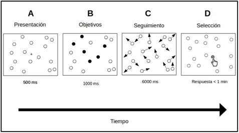 Multiple object tracking. Se programó la tarea experimental utilizando Python en su versión 3.4.2. (Van Rossum y Drake, 2009). En un ensayo típico de la tarea, el participante debe observar un conjunto de círculos (16 en total) de color blanco que aparece en la pantalla durante 500 ms. El radio de los círculos es de 0.61 grados visuales. Posteriormente, un subconjunto aleatorio de círculos, integrado por 4, 5 o 6 objetivos dependiendo del nivel de dificultad, cambian de color (a amarillo) y parpadean por un periodo de 1000 ms. Los objetivos vuelven a su color original y se confunden con los demás círculos. Enseguida, todos los círculos se mueven en trayectorias aleatorias en forma de ruido browniano a una velocidad de entre 0.3 y 1.2 grados visuales por segundo, chocando entre ellos o con los bordes de la pantalla por un periodo de 6000 ms. Cuando terminan de moverse, el participante debe identificar con el cursor los círculos que previamente se establecieron como objetivos y confirmar su respuesta usando la barra espaciadora en el teclado. Cuando finaliza la selección, el participante recibe retroalimentación de su desempeño reportando cuantos objetivos logró identificar de manera correcta. La Figura 1 muestra un diagrama en el tiempo para un ensayo de la tarea.