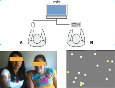 La tarea se desarrolló utilizando un monitor de 23 pulgadas con una resolución de 1900 x 1080 ppi y una distancia de visualización de 90 cm. Los participantes respondieron a la tarea MOT en tres niveles de dificultad (con 4, 5 y 6 objetivos a rastrear), cada uno con 30 ensayos y un tiempo de aplicación aproximado de 1 hora. El orden de aplicación del nivel de dificultad fue contrabalanceado. Una vez que finalizaron las sesiones individuales, se seleccionaron díadas de manera aleatoria sin repetición de individuos; cada díada realizó la tarea MOT en un día posterior a la sesión individual, en la que nuevamente se administraron los tres niveles de dificultad en orden de aplicación contrabalanceado. La sesión fue grabada en video para su posterior análisis; en esta, se codificaron las conductas de acuerdo a su definición utilizando el método de pasadas múltiples, donde se selecciona un participante en el video y una conducta a codificar durante toda la sesión de análisis. El proceso se repite hasta concluir con cada conducta de cada participante. La Figura 2 muestra la configuración experimental para las díadas.