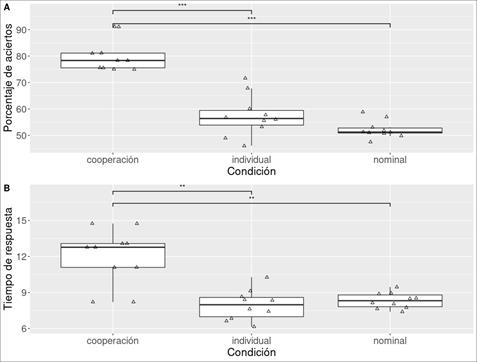 La comparación del porcentaje de aciertos entre condiciones (individual vs. cooperación vs. nominal) en la dificultad alta no presentó diferencias estadísticamente significativas utilizando una prueba de Friedman. Sin embargo, el análisis post-hoc arrojó diferencias claras entre la condición de cooperación y la condición individual (W = 100, p < 0.001, con un tamaño del efecto grande rbis = 0.84), donde el rendimiento fue superior en la condición de cooperación (MD = 78.30, R = 16.11) en comparación con la condición individual (MD = 56.38, R = 25.55) (ver Figura 3). En el tiempo de respuesta, la prueba de Friedman tampoco mostró diferencias estadísticamente significativas en el nivel de dificultad alto en relación con las tres condiciones; no obstante, se observaron diferencias entre la condición de cooperación y la condición individual (W = 90, p = 0.002, rbis = 0.84; cooperación: MD = 12.76, R = 6.54; individual: MD = 7.98, R = 4.11) y entre la condición de cooperación y la condición nominal (W = 90, p = 0.002, rbis = 0.82; nominal: MD = 8.31, R = 11.38). La Figura 3 muestra también la dispersión de los puntajes.