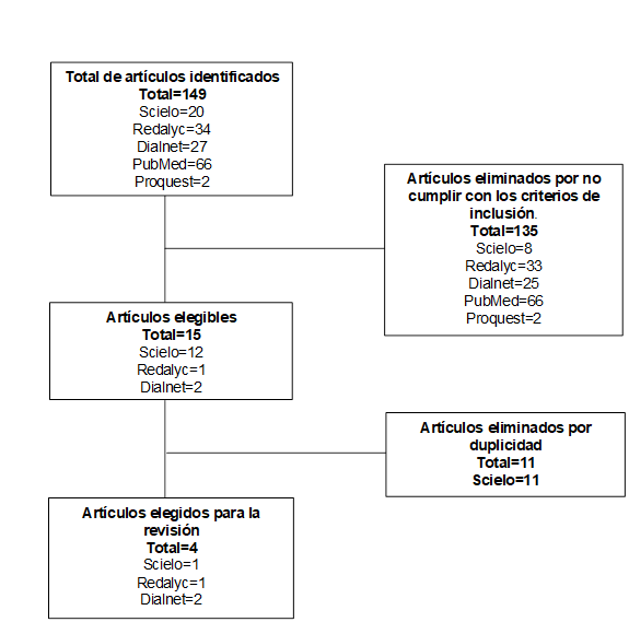 Se encontraron 149 artículos, 135 fueron descartados por no cumplir con los criterios de inclusión, obteniendo como elegibles 15, de los cuales se eliminaron 11 por duplicidad, quedando para su análisis un total de cuatro publicaciones. En la Figura 1, se muestra el diagrama de flujo de la búsqueda bibliográfica que se llevó a cabo. Se ilustra el total de artículos identificados, los eliminados por no cumplir con los criterios de inclusión, los eliminados por duplicidad y aquellos elegibles, así como los que se han seleccionado para su revisión, incluyendo el total por base de datos.