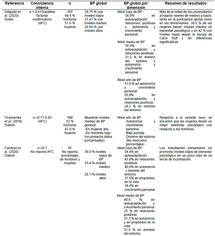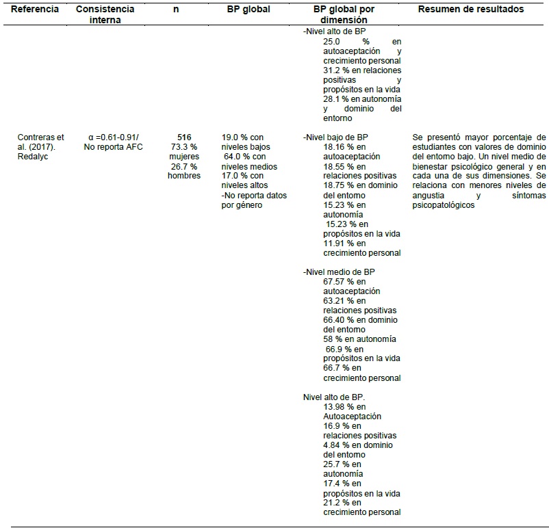 También, esta revisión permitió observar que existen muchos estudios relacionados con la adaptación y generación de estructuras factoriales y con la generación de nuevos modelos a través de análisis exploratorios y confirmatorios. Estos, por exclusión, no se analizaron, ya que solo hablan de propiedades psicométricas o adecuaciones estructurales para generar nuevos modelos y no muestran datos del grado de bienestar psicológico de las muestras analizadas. Por tanto, se encontraron muy pocos estudios sobre el grado de bienestar psicológico en esta población.