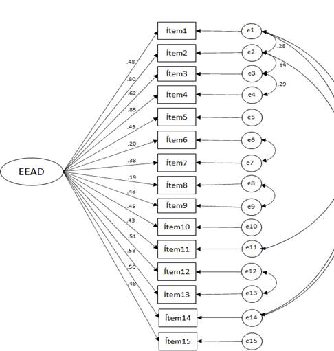 El análisis de validez convergente de EEAD, orientado a conocer si efectivamente existe una correlación positiva entra las pruebas empleadas (Acuña et al., 2017), arrojó resultados adecuados en su correlación con la escala de estrés percibido: r = 0.574, p < .001. Esto permite confirmar la hipótesis planteada de que ambas escalas, al medir un mismo constructo, se encontrarían positiva y significativamente relacionadas. Por último, en la Tabla 3 se presentan los pesos factoriales por ítem resultantes del análisis factorial confirmatorio, lo que nos permite ver la contribución de cada uno de estos al instrumento.