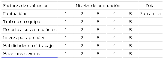 Método de escala de puntuación gráfica. Este método es el más simple de los utilizados para realizar evaluaciones al desempeño sobre el personal. Se muestra en una escala que enumera una serie de características deseables y se utiliza un rango de desempeño para cada variable, los reactivos pueden ser grados de calidad o confiabilidad, o, de satisfactorio hasta insatisfactorio para cada indicador. Simplemente se asigna un valor de la escala a cada indicador que describa de la mejor manera el desempeño y al final se realiza la sumatoria de cada reactivo o variable (Tabla 2).