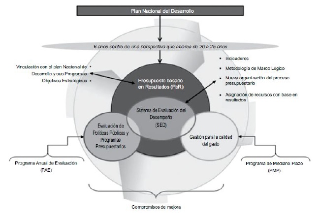El sistema de evaluación del desempeño en el sector público en México, en sus inicios se vinculó de manera sustancial al proceso presupuestario, el inicio de dicho proceso comienza con la presentación del Plan Nacional de Desarrollo (PND), el cual establece objetivos generales a mediano plazo (6 años), estos objetivos se materializan en el diseño de un presupuesto público basado en resultados el cual define sus proyectos estratégicos a través de la metodología del marco lógico, el cual vincula los objetivos estratégicos con los programas sociales derivados del PND.