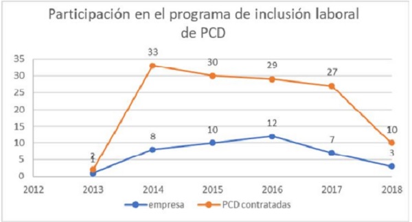 En la figura 2 se presenta la gráfica de personas colocadas en empresas participantes en el programa de rehabilitación e inclusión laboral y las empresas participantes en la administración pasada (2013-2018) y en la cual se puede apreciar el decremento de participación de las empresas y contrataciones a PCD durante el periodo estudiado.