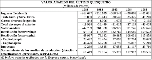 A pesar del escaso arraigo del EVA/ERGD en el mundo empresarial español, algunas compañías presentaron dicho estado en sus informes anuales. Uno de los casos más destacados fue el de Telefónica (de titularidad pública en aquellos momentos) que en su memoria anual de 1985 presentaba dentro del capítulo III “Economía y Finanzas” (Telefónica, 1985, p. 62) un EVA referido al último lustro (Tabla 2).