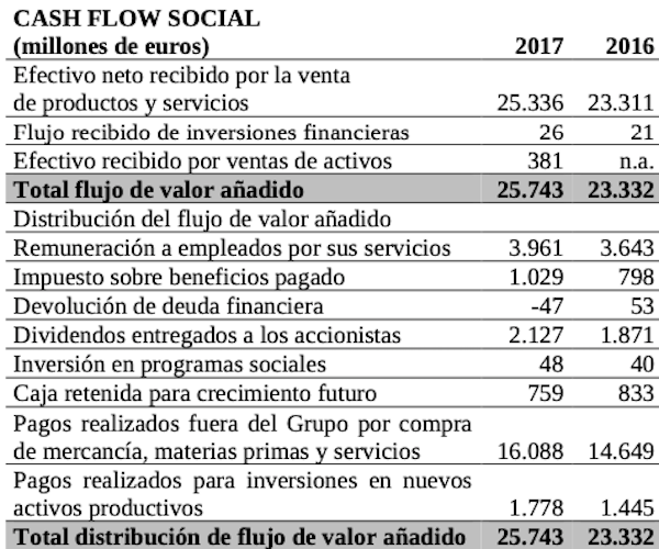 Ahora bien, aunque se siga el modelo de la GRI pueden observarse diferencias en la presentación. A título ilustrativo cabe citar los informes de Iberdrola de 2018 e Inditex de 2017 (ver Tablas 3 y 4). Mientras el primero se muestra de acuerdo con el principio del devengo, el segundo lo hace bajo el principio de caja o efectivo, con un Estado de flujos de caja social. En cualquier caso, todos estos informes se caracterizan por no explicar cómo se han obtenido las cifras presentadas12.