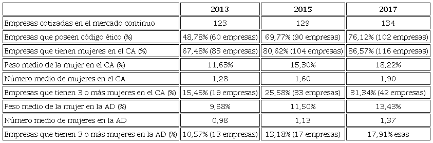 No obstante señalar que, la mujer está más presente y con mayor peso en el consejo de administración que en el equipo de alta dirección en los tres años analizados. Además, las tasas de variación de 2013 a 2017 son casi siempre mayores en el primer órgano que en el segundo.