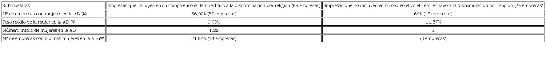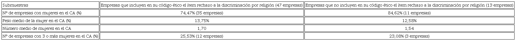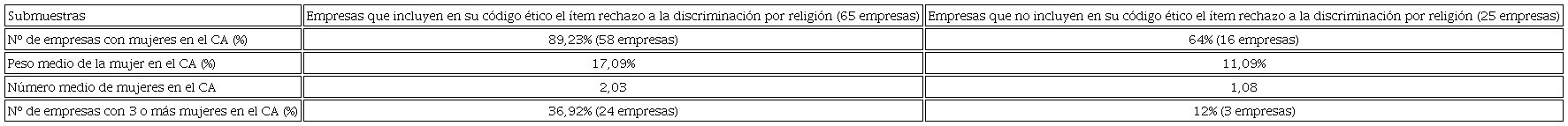 Desde el punto de vista del análisis estadístico no parece observarse una relación entre la presencia de mujeres en la alta dirección y la inclusión en el código ético de la empresa del rechazo a la discriminación por motivos de religión, pues si se aplica la prueba χ2 de Pearson para un α = 0,05, el p-value se sitúa en 0,754. Los mismos valores se obtienen en el caso de considerar la presencia de tres o más mujeres. Tampoco cuando se analiza el peso relativo de las mujeres en los altos puestos directivos el resultado es significativo según el test de Wilcoxon-Mann-Whitney (para un α = 0,05, el p-value fue de 0,9440).