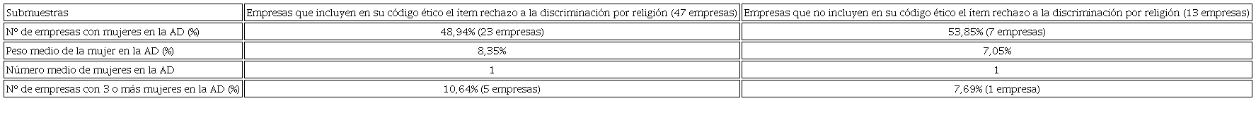 Por tanto, en el año 2015 la presencia de más de dos mujeres, tanto en el consejo de administración como en la alta dirección, influye en que la empresa incluya el rechazo a discriminar por motivos de religión en su código ético. Sin embargo, en el año 2017 solo se produce esta situación en el consejo de administración.