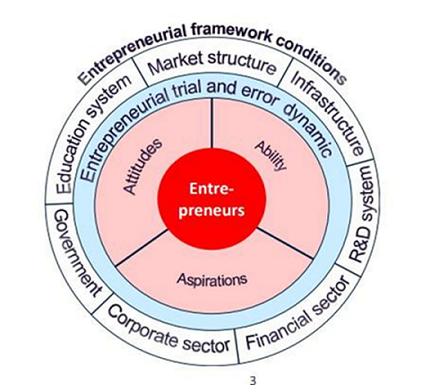 El emprendimiento también es visto como un ecosistema que puede ser estimulado en una combinación de personas, recursos disponibles a nivel global o regional y otros sectores mostrados en la Figura 1 que enmarcan y condicionan su desempeño (Ács, Szerb, Lafuente y Márkus, 2020). En dicha estructura, las capacidades y aspiraciones empresariales de cada jóven son estimulados por la infraestructura, el mercado, el sistema educativo y demás sectores, hasta que logran ser motivados a convertirse en nuevos emprendedores por las actitudes que prevalecen en el grupo poblacional, de ahí la importancia de todo el ecosistema en su conjunto.